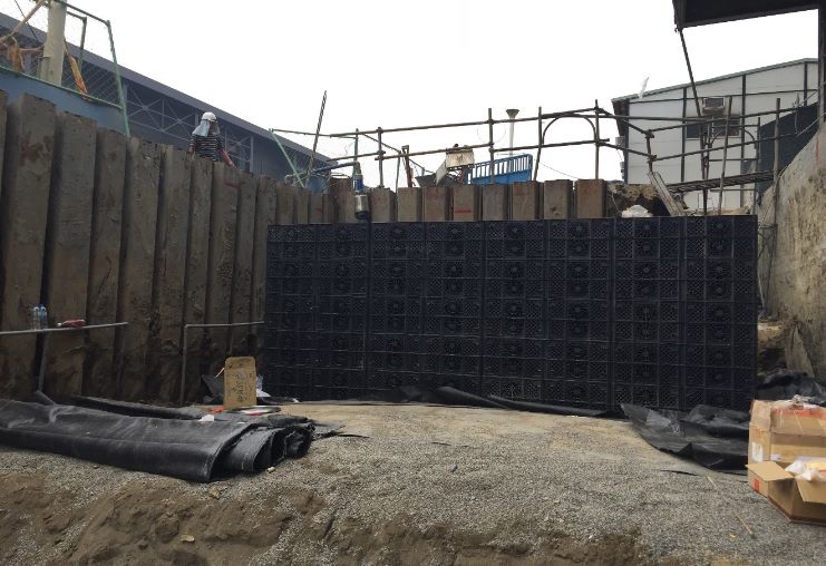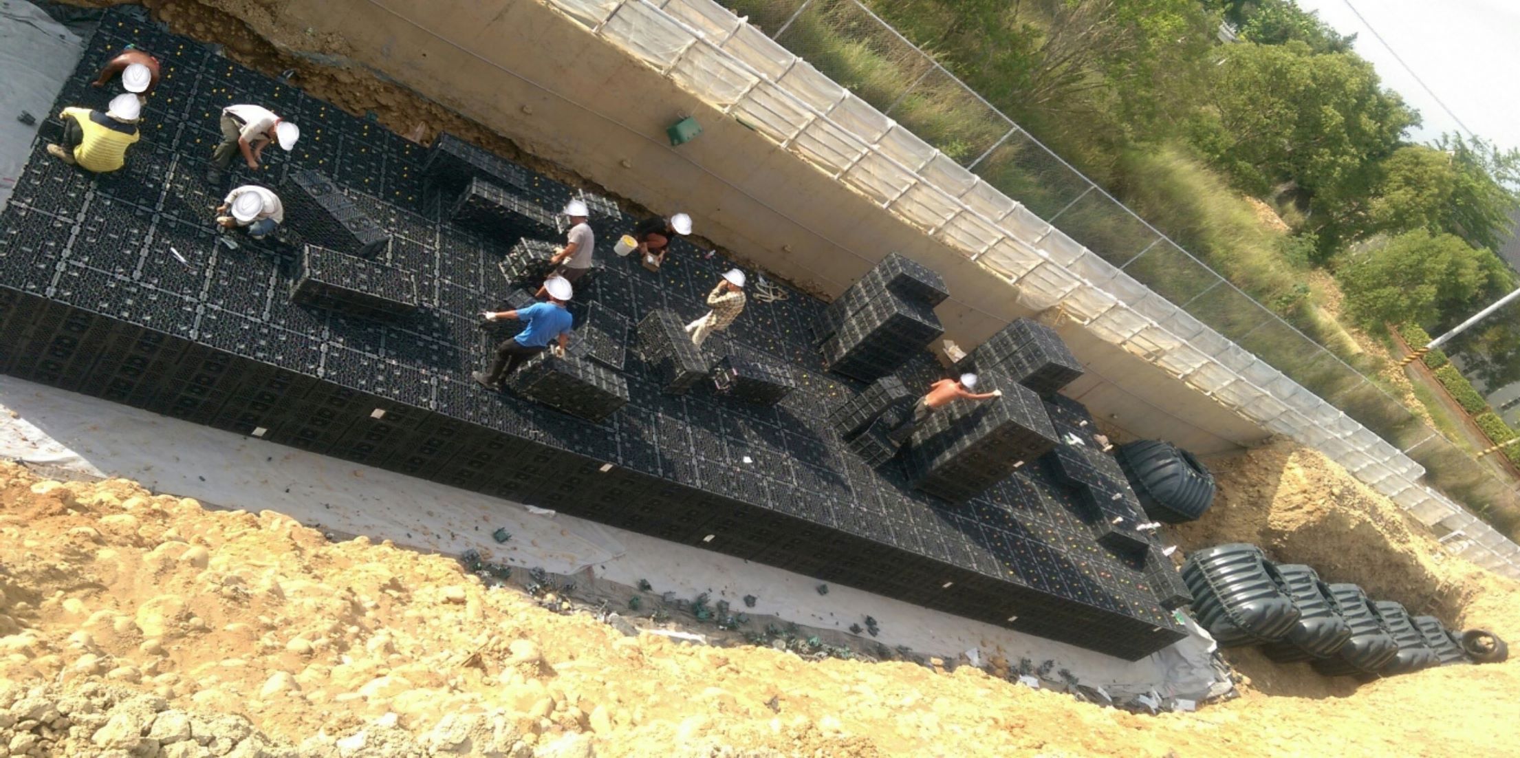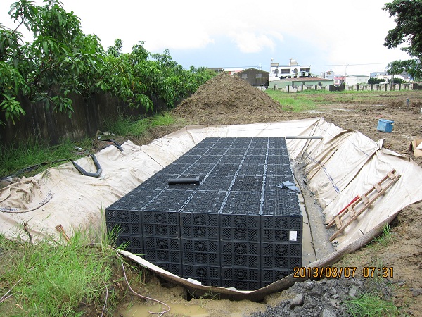 們從組裝影片看得出雨水貯留滲透設備施工快速、簡單安裝。採積木式堆疊。